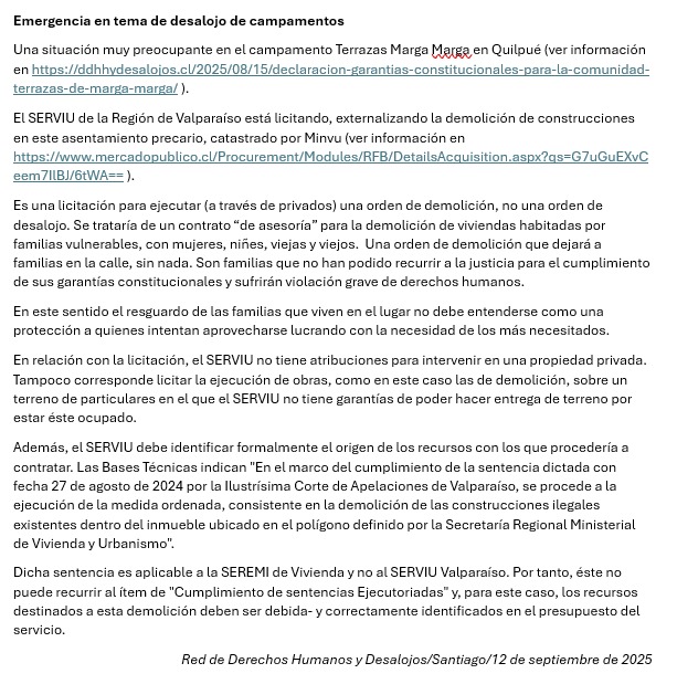 La Red de Derechos Humanos y Desalojos en Chile busca detener y prevenir los desalojos forzosos, promoviendo y coordinando acciones de monitoreo, protocolo y aprendizaje desde una perspectiva de derechos humanos.