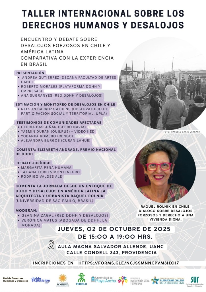 La Red de Derechos Humanos y Desalojos está organizando un Taller Internacional sobre Derechos Humanos y Desalojos, un espacio de encuentro y debate en torno a los desalojos forzosos en Chile y América Latina, con una mirada comparativa desde la experiencia en Brasil junto a la arquitecta y urbanista Raquel Rolnik.