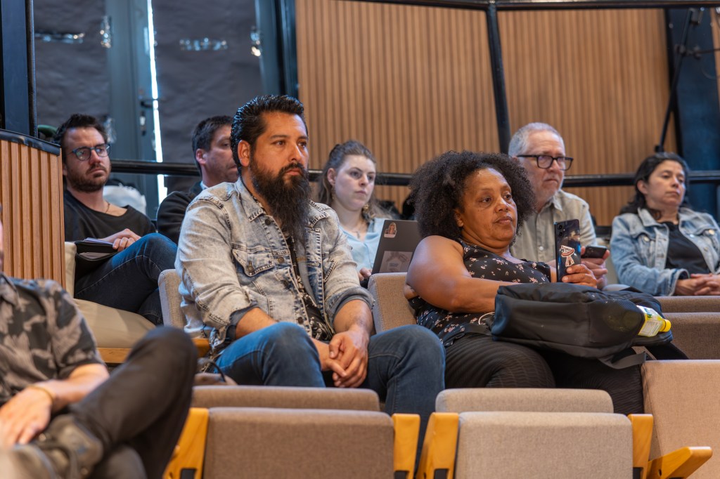 La primera parte del taller continuó con los testimonios de Yasmin Durán, dirigenta de la Comunidad Terrazas de Marga Marga, Calichero, Quilpué, desalojada el 30 de septiembre de 2025, sin haber sido notificada de orden de desalojo; Gloria Bascuñán, dirigenta de la Cooperativa “17 de Mayo”, desalojada el 16 de mayo de 2024, a un día del 5° aniversario de la Toma “17 de Mayo” en Cerro Navia; Yocoba Romero, dirigenta de la Comunidad Tricolor, campamento de familias bolivianas en Rengo, luchando contra la amenaza de desalojo desde la Municipalidad; y Alejandra Burgos, vocera de comunidades afectadas con amenazas de desalojo por parte de la empresa Arauco, en Curanilahue, Región del Biobío.